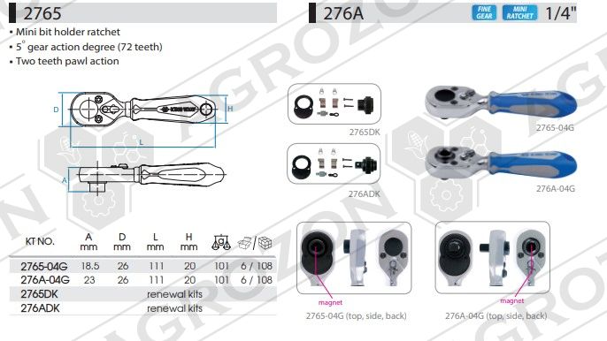 Квадрат 1/4" Кількість зубців 72 шт Довжина 111 мм Додаткова властивість Бітоутримувач прогумована ручка Країна торгової марки Тайвань Країна виробник Тайвань Артикул 276A-04G Тріскачка King Tony 276A-04G є інструментом, який служить для передачі обертального руху при монтажі/демонтажі вузлів різьбових з'єднань різної складності. Завдяки своїй функціональності та зручності в експлуатації тріскачка стала одним із найчастіше використовуваних інструментів серед автомеханіків та рядових автолюбителів. Тріскачка оснащена храповим механізмом на 72 зуби, який забезпечує максимально плавне та м'яке обертання. Ця тріскачка не призначена для силової роботи, її рекомендується використовувати з різьбовими з'єднаннями з вільним ходом. Кут нахилу до клацання у тріскачки всього 5 градусів, що дозволяє працювати у важкодоступних та вузьких місцях застосовуючи найменшу амплітуду обертання. Конструкцією тріскачки передбачено посадкове місце з магнітом для фіксації біт з квадратом 1/4". Це робить тріскачку більш універсальною і дозволяє працювати з бітами без перехідників.
