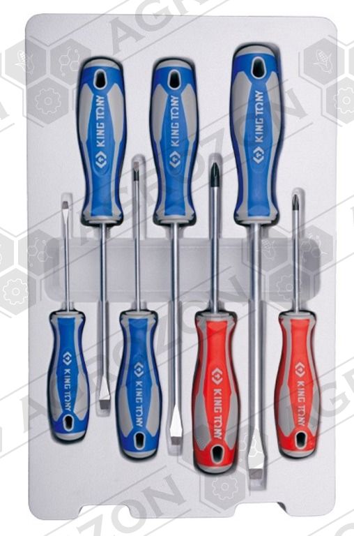 Викрутки (набір 7 ін.) Викрутка Філіпс 1421 (No.1 x 80, No.2 x 100) Викрутка шліцева 1422 (3 x 75, 4 x 100, 5.5 x 125, 6.5 x 150, 8 x 175) Набір викруток KING TONY 30117MR призначений для монтажу та демонтажу кріпильних вузлів різних виробів, пристроїв та агрегатів. Особливості набору • Високоточна обробка намагнічених наконечників дає ідеальний контакт із кріпленням. • Ергономічні двокомпонентні рукоятки PP+TPR стійкі до дії масел, бензину, кислот та лугів. • Матеріал робочої частини викруток SNCM+V – легована сталь із додаванням молібдену, покриття хром.