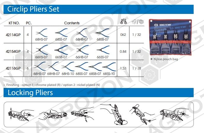 Набір знімачів стопорних кілець 6ін. KINGTONY 42116GP 68HB-07 68HS-07 68HS-10 68SB-07 68SS-07 68SS-10 Набір знімачів стопорних кілець 6пр - це щипці для роботи зі стопорами, що не мають вушок. Працює пристосування за принципом ножиць - загострені наконечники зводяться і розводяться завдяки рукояткам, що рухаються. Універсальний набір підходить для зняття та встановлення внутрішніх та зовнішніх стопорних кілець. Вигнуті та прямі на розтиск та стиск знімники прості в експлуатації та не вимагають використання додаткового інструменту. Зйомники призначені для автосервісу, але потрібні у виробництві та побуті. Відмінна комплектація та ергономічний дизайн – переваги набору. Зйомники поставляються в матер'яному полотні, що замінює кейс для зберігання. Вологовідштовхувальний матеріал стійкий до агресивного середовища. Під кожен інструмент передбачена кишенька. У верхніх кутах полотна є люверси – отвори для підвішування набору інструментів до стіни або стелажу. Надійність та довговічність знімачам забезпечує інструментальна сталь, з якої виготовлені пристрої. Прогумовані рукоятки додають зручності в експлуатації. Тайванський виробник King Tony супроводжує продукцію сертифікатом якості та дає офіційну довічну гарантію на інструмент.