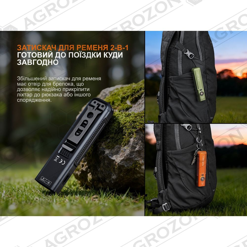 Конструкція передбачає кілька способів носіння: у корпусі є отвір для кріплення ремінця або карабіна, а металева кліпса дозволяє фіксувати пристрій на поясі, ремені або кишені рюкзака.