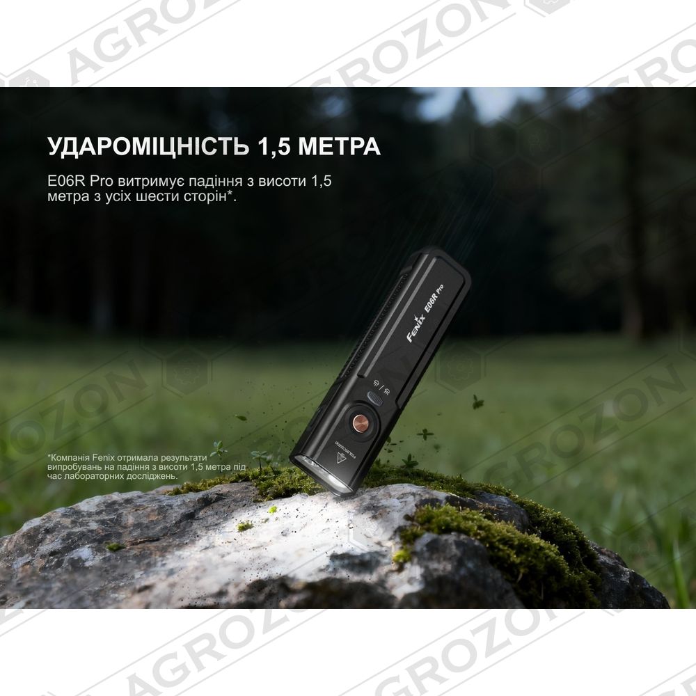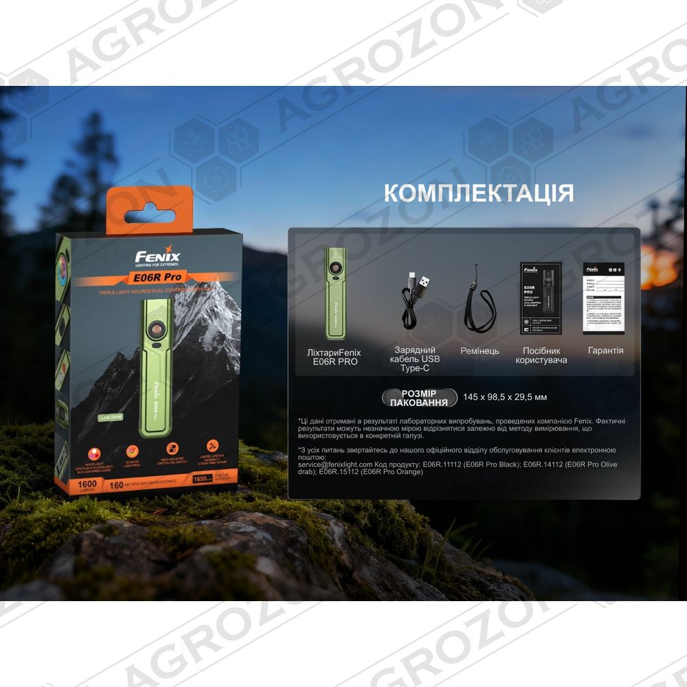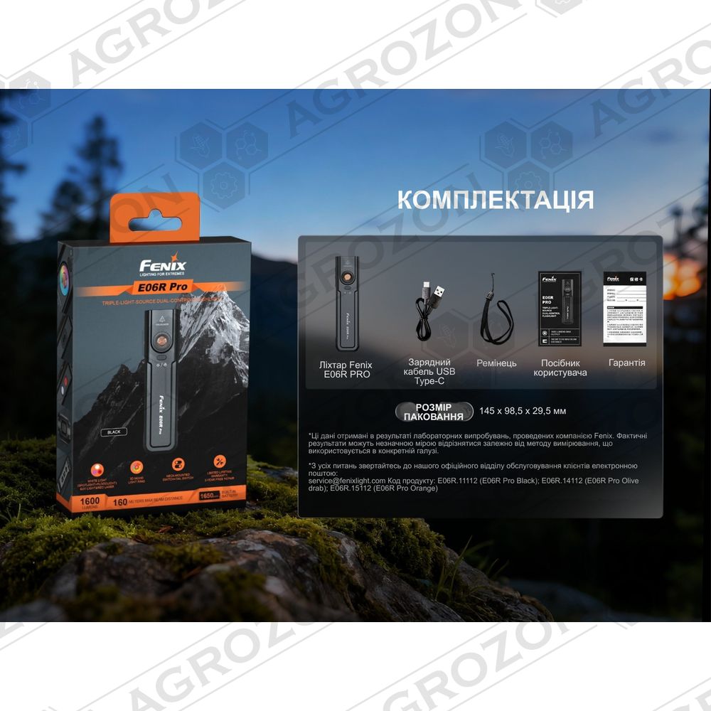 Ліхтар Fenix E06R PRO, зарядний кабель USB-C, темляк, інструкція користувача, гарантійний талон.