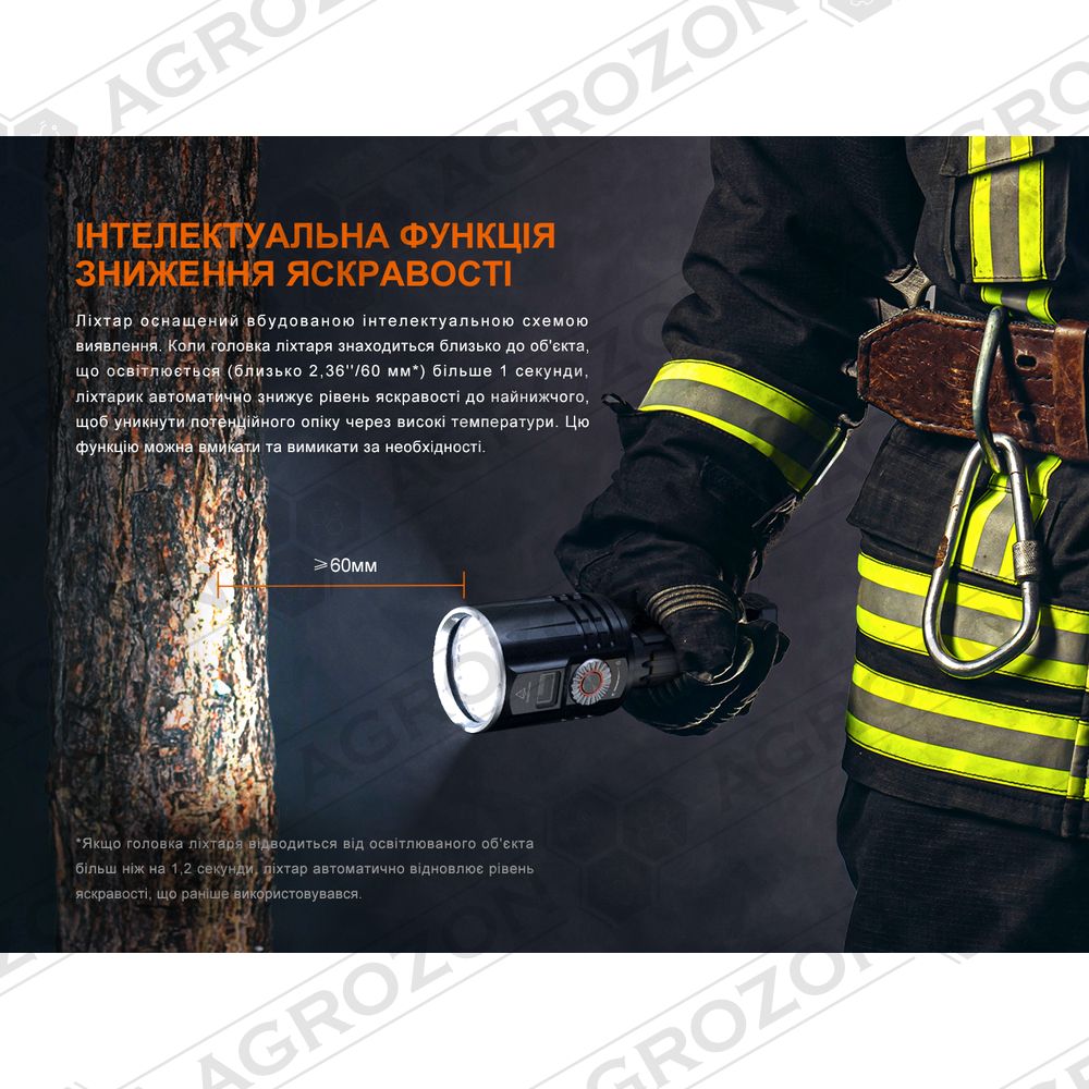 Ще одна корисна функція — інтелектуальний датчик наближення. Він спрацьовує щоразу, коли ліхтар наближається до освітлюваного об'єкта на < 60 см і автоматично знижує яскравість до безпечного рівня, щоб запобігти займанню предмета через вплив надпотужного променя.