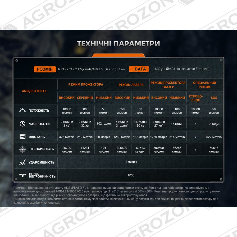 - Високий: 10000 лм – 26700 кд – 2 год 3 хв – 326 м;