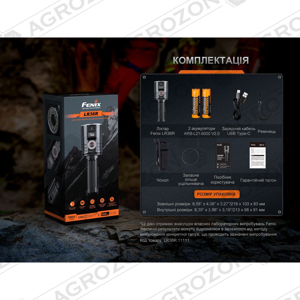 Ліхтар Fenix LR36R, кілька акумуляторів Fenix ARB-L21-5000 V2.0, кабель USB для заряджання, запасне ущільнювальне кільце, темляк, чохол з можливістю кріплення на пояс, інструкція користувача, гарантійний талон.