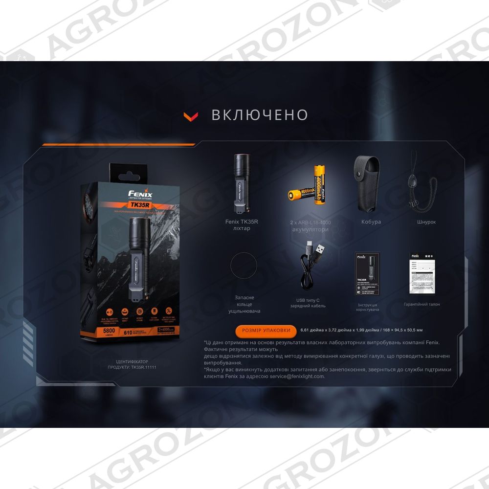 Ліхтар Fenix TK35R, акумулятори Fenix ARB-L18-4000 (2 шт), зарядний кабель USB-C, запасне ущільнювальне кільце, темляк, чохол на пояс, посібник користувача, гарантійний талон.