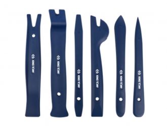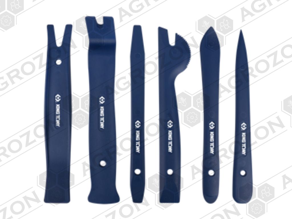 Набір знімачів (лопатки) для панелей облицювання, 6 предметів KING TONY 9CI016. У набір входять лопатки різних розмірів та типів. Лопатки призначені для демонтажу різних кліпс, фітингів, замків та інших кріпильних пластикових елементів. Форма знімачів дозволяє застосовувати набір при розбиранні облицювальних та приладових панелей автомобіля, не побоюючись їх пошкодити. Матеріал: високоміцний нейлон, стійкий до олій та розчинників.
