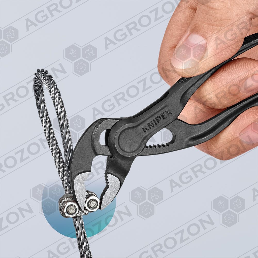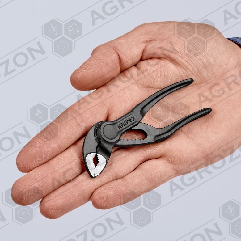 KNIPEX Cobra® XS захоплення як великого: маленький повністю функціональний кліщі у світі. Оптимальна доступність у недоступних місцях: особливо компактна конструкція, дуже тонка голова. Одноручне регулювання для легкої адаптації до різних розмірів заготовки шляхом натискання. Постійне безпечне захоплення завдяки високій зносостійкості